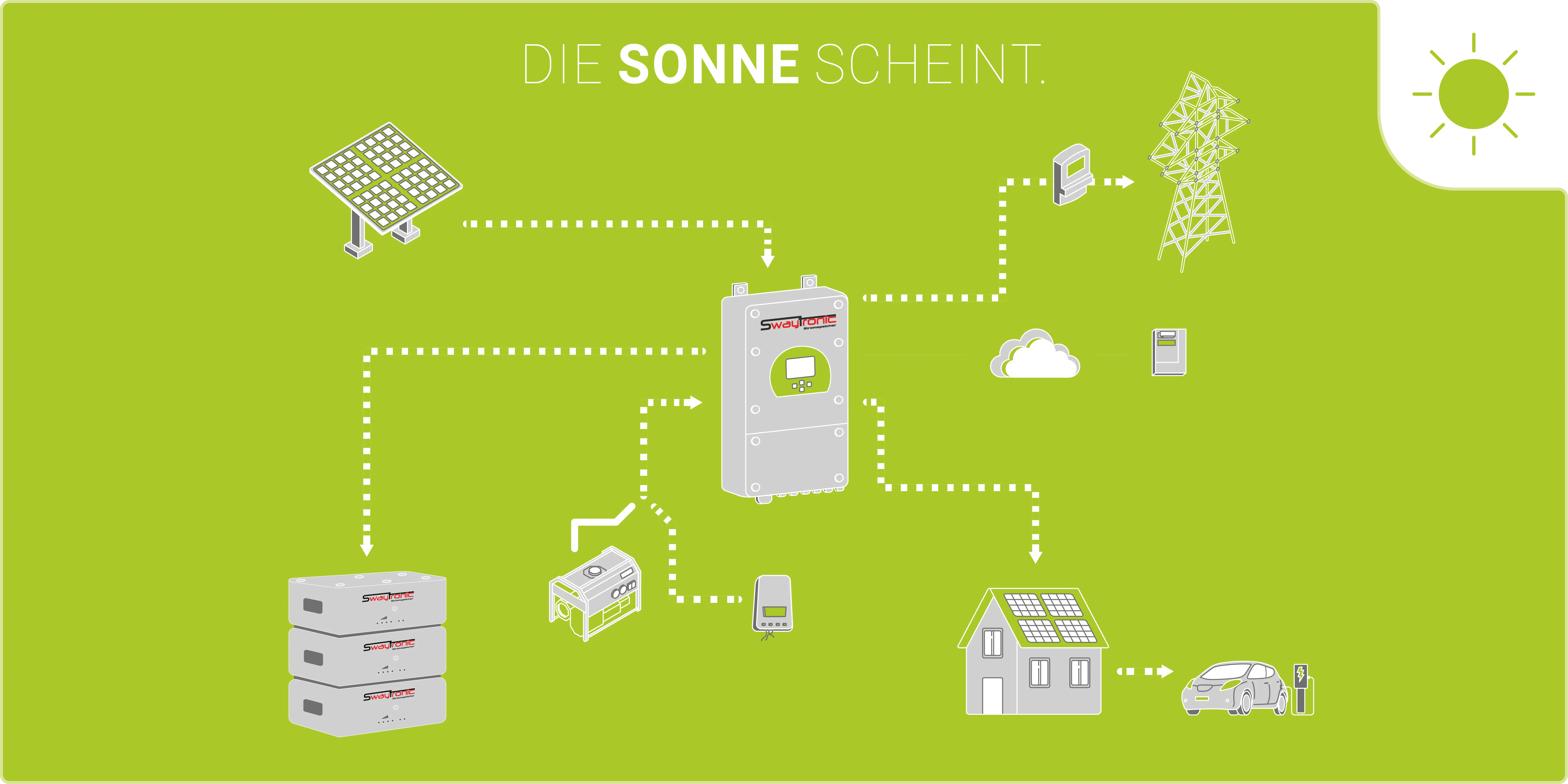 Wenn die Sonne scheint, produziert das System je nach Stärke, Position und Ausrichtung der Solaranlage die meiste Energie. In diesem Optimalfall werden alle Verbraucher in erster Priorität mit Sonnen-Energie versorgt. Mit dem resultierenden Überschuss an Energie, wird direkt die Batterie geladen. Sollte die Stromproduktion die Summe dieser beiden Träger übersteigen, verkauft die Anlage den Über-Überschuss in das öffentliche Stromnetz.