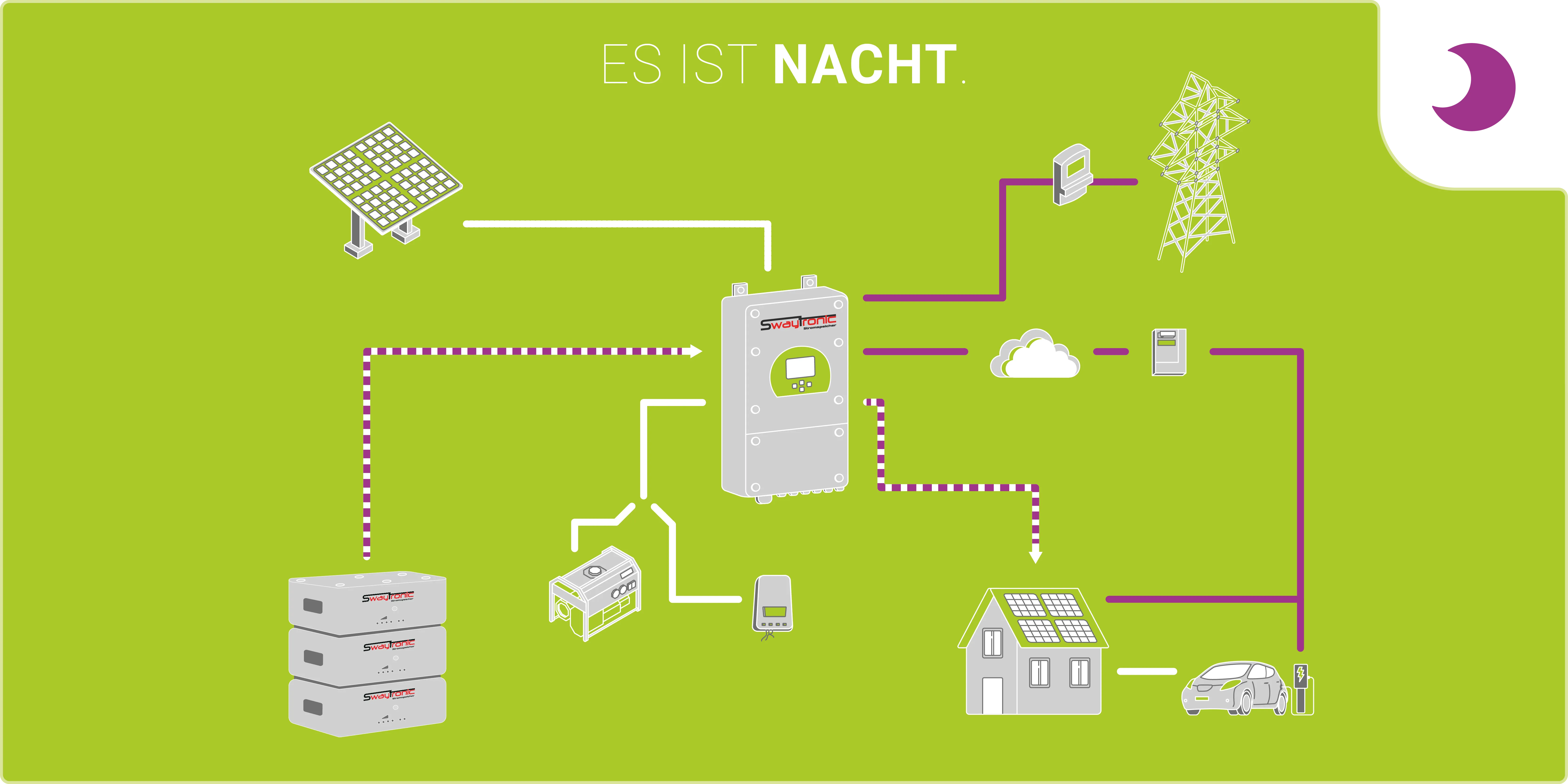 Des Weiteren bestimmen die Verbraucher in der Nacht, sowie die gewählte Batteriekapazität (Energiemenge) die Dauer der Versorgung ab Batterie. Das System ist so konfiguriert, dass so wenig wie möglich, aber so viel wie notwendig vom Netz bezogen wird. Auch hier entscheidet der Nutzer direkt, wie und wann der Batteriestrom verbraucht wird.