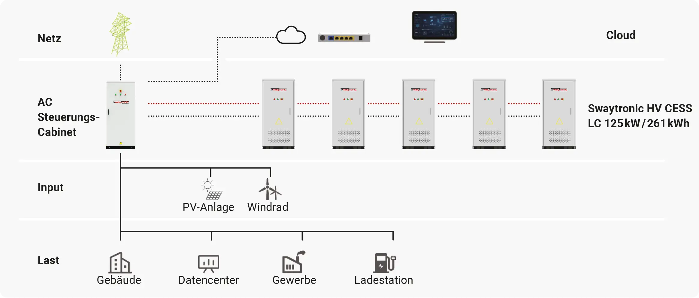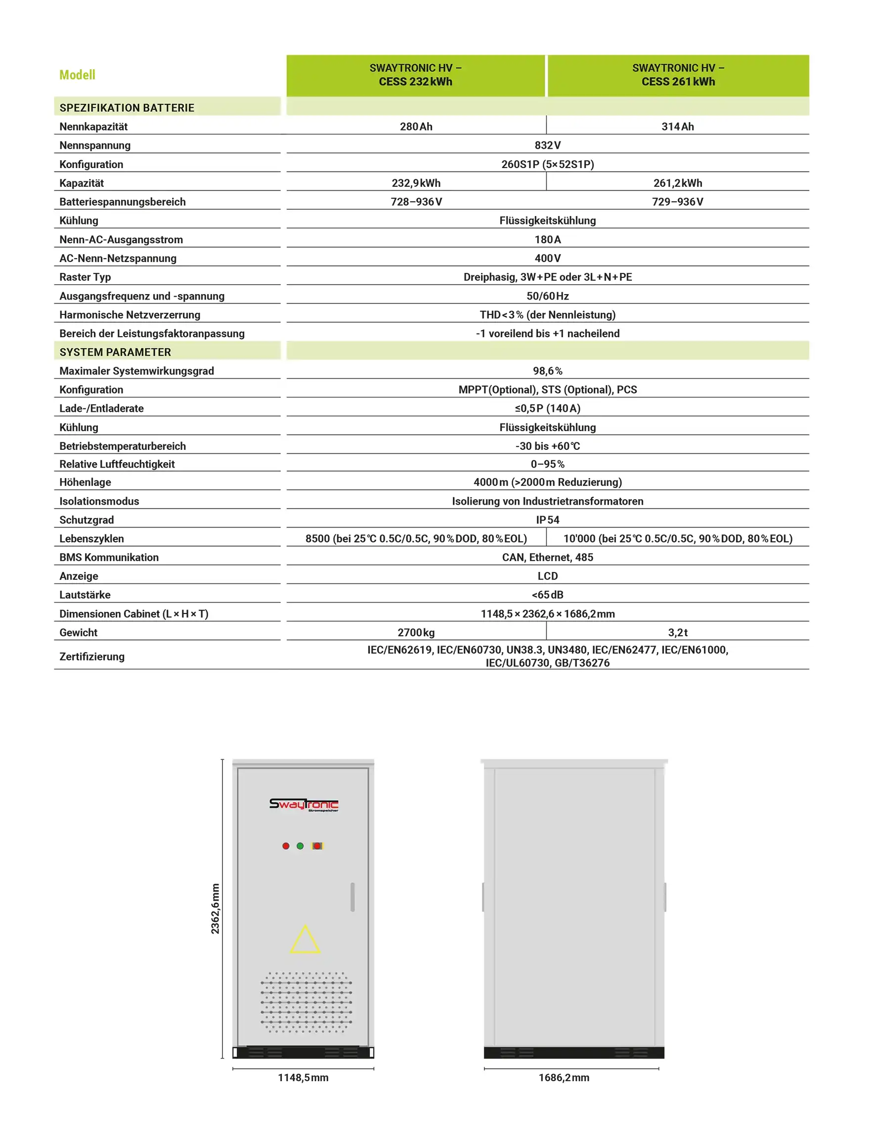 Das SWAYTRONIC HV – CESS ist ein ALL-IN-ONE System ist auf bis über 10 Einheiten parallel (insgesamt 2610 kWh) skalierbar und eignet sich ideal für energieintensive Einrichtungen wie Fabriken, Einkaufszentren, landwirtschaftliche Betriebe, Microgrids und EV-Ladestationen.